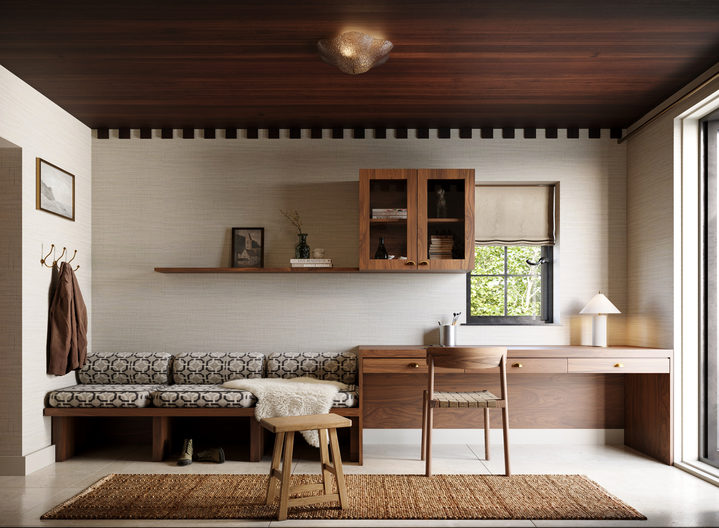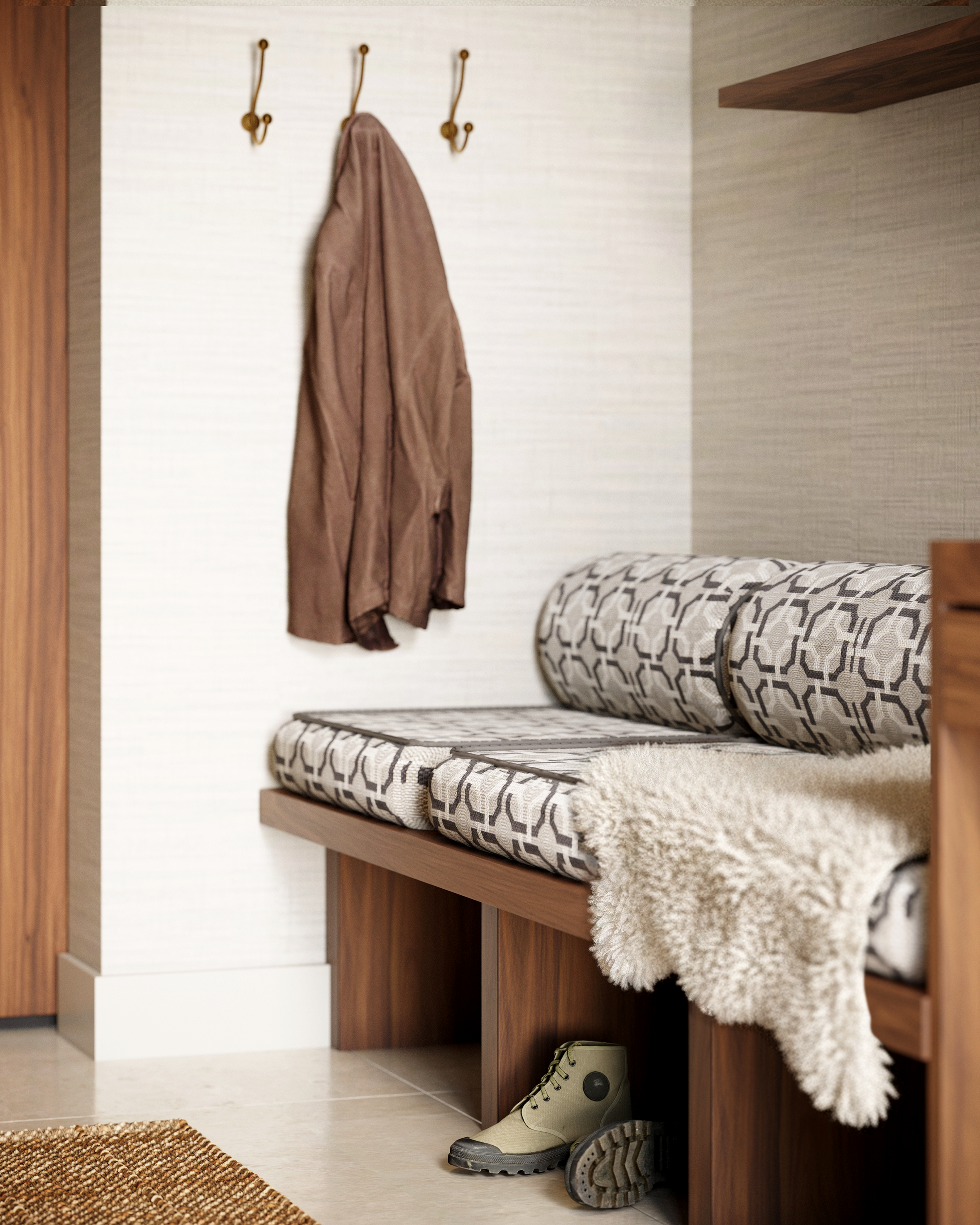 The built-in bench is upholstered in a jacquard weave fabric, finished with dark piping for subtle definition. A round back cushion adds comfort and support, reinforcing the idea of the space as somewhere to pause and rest, rather than simply pass through. Layered textures, including a sheepskin rug, introduce warmth and tactility underfoot.